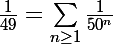 Je me dis que ça veut peut-être strictement rien dire parce qu'on pourrait tout aussi bien dire que 1/3 vaut la sommation des 3/10^n pour n=1 ou encore plus bêtement que 1/7 vaut la sommation des 142857/1000000^n, mais ce n'est pas vraiment là où je veux en venir.