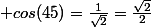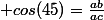 cos45 =ab sur ac=1 sur racine de 2 = racine de 2 sur 2