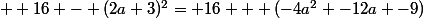 = 16 - [(2a)² + 2[FONT=Arial]X[/FONT]2a[FONT=Arial]X[/FONT]3 +3²]