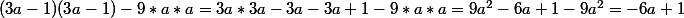 (3a-1)-9*a*a=3a*3a-3a-3a+1-9*a*a=9a^2-6a+1-9a^2=-6a+1)