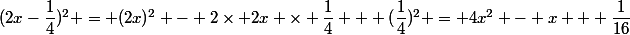 (2x-1/4)²=((2x) + (-1/4))² de la forme (a+b)²