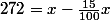 après une diminution de 15 %, la relation qui lie l'ancien prix au nouveau prix est y=x-(x*15/100)=x-0.15x=x(1-0.15)=0.85x
