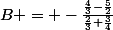B = (4/3 - 5/2) divisé par (- 2/3 + 3/4) Pour information, le "-" dans la deuxième parenthèse est à gauche de la barre (la _ qu'on met normalement pour dire 3 sur 4 par exemple)