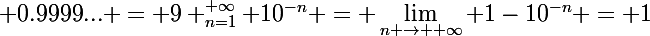 0.9999... avec une infinité de 9 ( dans le sens où c'est une somme infinie de) c'est bien 1, car