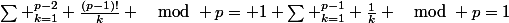 !}{k} \mod p= 1+\sum \limits_{k=1}^{p-1} \frac{1}{k} \mod p=1)