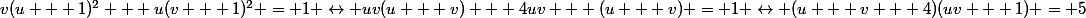 ^2 + u(v + 1)^2 = 1 \leftrightarrow uv(u + v) + 4uv + (u + v) = 1 \leftrightarrow (u + v + 4)(uv + 1) = 5)