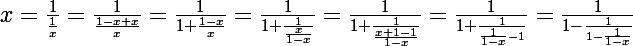 +f\left(\frac{1}{1-x}\right) &=& x \\<br />f\left( \frac{1}{1-x} \right) + f\left( \frac{1}{1-\frac{1}{1-x}} \right) &=& \frac{1}{1-x} \\<br />f\left( \frac{1}{1-\frac{1}{1-x}} \right) + f\left( \frac{1}{1-\frac{1}{1-\frac{1}{1-x}}} \right) &=& \frac{1}{1-\frac{1}{1-x}} \\<br />\end{array} \right.)