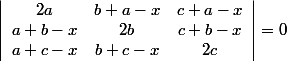 Donc on développe le déterminant dans la joie (ou alors on se contente de calculer les coefficients devant x^3, xab, xa², et x²a), on divise par x, et on obtient normalement l'équation homogène de degré 2 a²+b²+c²+x² = ab+ac+ax+bc+bx+cx.