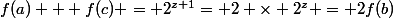 + f(c) = 2^{z+1}= 2 \times 2^z = 2f(b))