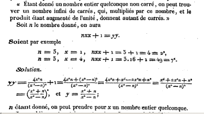 "Etant donné un nombre entier quelconque non carré, on peut trouver un nombre infini de carrés, qui, multipliés par ce nombre, et le produit étant augmenté d l'unité, donne autant de carrés".