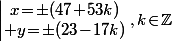 \cr y\!=\!\pm(23\!-\!17k)\end{matrix}\right.\ ,\ k\!\in\!\mathbb{Z})