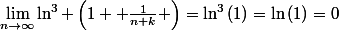 }=\lim\limits_{n\to\infty}\ln^3{ \left(1+ \frac{1}{n+1} \right)}+\ln^3{ \left(1+ \frac{1}{n+2} \right)}+...+\ln^3{\left(1+ \frac{1}{2n} \right)}+\ln^3{ \left(1+ \frac{1}{2n+1} \right)})