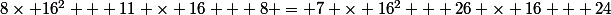 26 +1 = 27 = 16 + 11 , donc le 2ème chiffre du résultat est B et on retient 1 pour le troisième chiffre