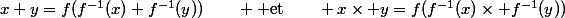+f^{-1}(y))\qquad {\rm et}\qquad x\times y=f(f^{-1}(x)\times f^{-1}(y)))