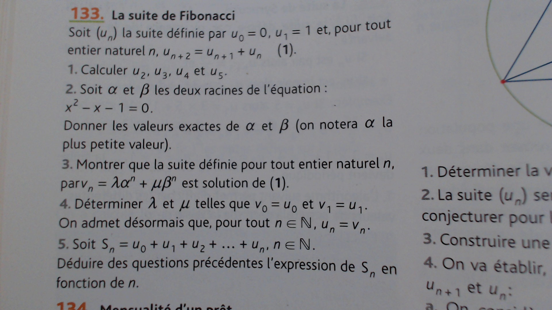 Etant en 1e S, j'ai à rendre un devoir concernant les suites. Celui-ci comporte un exercice qui fait intervenir la suite de Fibonacci, dont le concept en lui-même est plutôt simple. Cependant, on nous demande une petite démonstration pas piquée des hannetons ; à partir de la question 3, comment dire ... je bloque. Voyez de vous-même.