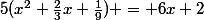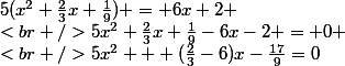 = 6x+2 \\<br />5x^2+\frac{2}{3}x+\frac{1}{9}-6x-2 = 0 \\<br />5x^2 + (\frac{2}{3}-6)x-\frac{17}{9}=0)