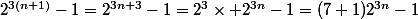 }-1=2^{3n+3}-1=2^3\times 2^{3n}-1=(7+1)2^{3n}-1)