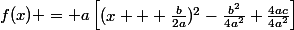 = ax^{2} + b x + c = a \begin{bmatrix}(x+\frac{b}{2a} )^{2} - \frac{b^{2}}{4a^{2}} + \frac{4ac}{4a^{2}}\end{bmatrix})