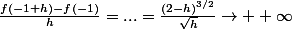 -f(-1)}{h}=...=\frac{(2-h)^{3/2}}{\sqrt{h}}\to +\infty)