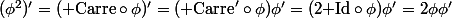 '=({\rm Carre}\circ\phi)'=({\rm Carre}'\circ\phi)\phi'=(2{\rm Id}\circ\phi)\phi'=2\phi\phi')