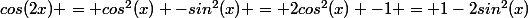 = cos^2(x) -sin^2(x) = 2cos^2(x) -1 = 1-2sin^2(x))