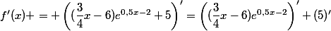 Bonjour j'ai un problème avec une dérivé , je ne vois comment dérivé f(x)=(3/4 x -6)e°0,5x-2 +5