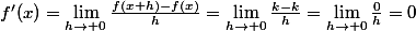 =\lim_{h\to 0}\frac{f(x+h)-f(x)}{h}=\lim_{h\to 0}\frac{k-k}{h}=\lim_{h\to 0}\frac{0}{h}=0)