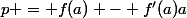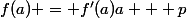 Pour retrouver cette formule, tu sais que le coefficient directeur de cette tangente vaut f'(a) donc l'équation s'écrit y = f'(a).x + p