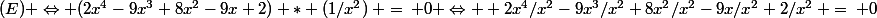 Pour montrer que (E) équivaut à (E') il faut factoriser (E) par x² en n'oubliant pas de justifier que 0 n'est pas solution.