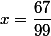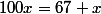Bonjour à tous j’ai un problème avec mon exercice 2 je n’ai absolument rien compris. On considère le nombre x = 0,67676767...Le développement décimal de ce nombre est donc infini et périodique on note alors x=0,[67].Demontrez que 100x=67+x