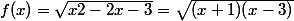 racine carrée de x2-2x-3; j'ai calculer delta et j'ai trouvé comme racine évidente -1 et 3. Mais le problème c'est que je n'arrive pas à mettre les crochets à cause de la racine carrée. Pouviez vous m'aider ?