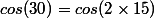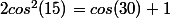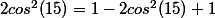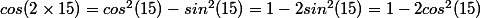 =cos^2(15)-sin^2(15)=1-2sin^2(15)=1-2cos^2(15))