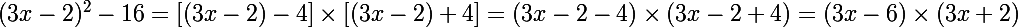 ^2}-16={[(3x-2)-4]\times{[(3x-2)+4]=(3x-2-4)\times(3x-2+4)=(3x-6)\times(3x+2))