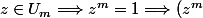 ^k = 1^k \Longrightarrow z^{m \cdot k} = 1 \Longrightarrow z^n = 1 \Longrightarrow z \in U_n)