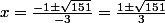 Alors, le problème intervient après. J'obtiens x1 égal moins racine de 151 + 1 le tout sur 3 ; et x2 égal racine de 151 + 1 le tout sur 3.
