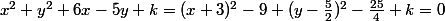 ^{2}-9+(y-\frac{5}{2})^{2}-\frac{25}{4}+k=0)