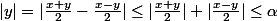 \in \mathbb{R^2})\;(\foral \alpha > 0 ) \;: \;|\frac{x+y}{2}|+|\frac{x-y}{2}|>\alpha \;\Rightarrow \;|x|> \alpha \;\mathrm{ou}\; |y|> \alpha)