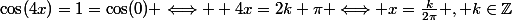 =1=\cos(0) \Longleftrightarrow 4x=2k \pi \Longleftrightarrow x=\frac{k}{2\pi} , k\in\mathbb{Z})