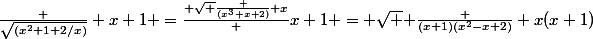 alors g(-1)=0 donc je trouve racine de (x²+1+2/x)/(x+1) pour essayer de retrouver l'expression demandée je multiplie par x mais on a le droit de multiplier ce qu'il y a sous le radical simplement? car après on trouve racine de x^3+x+2 /x(x+1) et comme ça grace a la question 3 je remplace racine de x^3+x+2 par racine de (x+1)(x²-x+2) et enfin j'arrive presque a la meme expression demandée sauf qu'il faut que la racine soit pour toute l'expression or ds mon calcul la racine n'est mise qu'au numérateur. alors comment fait-on SVP ? :help:
