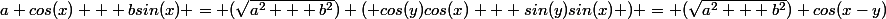 + bsin(x) = (\sqrt{a^{2} + b^{2}}) ( cos(y)cos(x) + sin(y)sin(x) ) = (\sqrt{a^{2} + b^{2}}) cos(x-y))