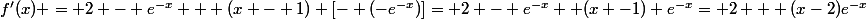 On peut regrouper e^-x et 2e^-x pour obtenir: f''(x) = (3-x)e^-x.