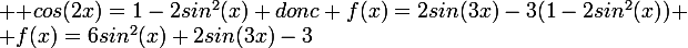 =1-2sin^2(x) donc f(x)=2sin(3x)-3(1-2sin^2(x)) \\ f(x)=6sin^2(x)+2sin(3x)-3)