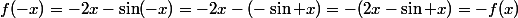 =-2x-\sin(-x)=-2x-(-\sin x)=-(2x-\sin x)=-f(x))
