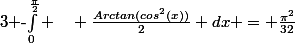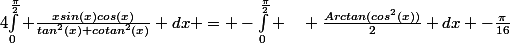 Conclusion:cos(x)}{tan^2(x)+cotan^2(x)} dx = -\int_0^{\frac{\pi}{2}} \quad \frac{Arctan(cos^2(x))}{2} dx -\frac{\pi}{16})
