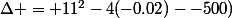 =(11)^2-4*(-0.02)*(-500)