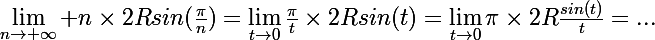 =\lim_{t\to0}\frac{\pi}{t}\times{2R}sin(t)=\lim_{t\to0}\pi\times2R\frac{sin(t)}{t}=...)