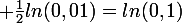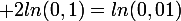 - 2 ln(0,1) + \frac{1}{2}ln(0,01) \\<br />= \frac{1}{2}ln(10^2) - 2ln(10^{-1}) + \frac{1}{2}ln(10^{-2}) \\<br />= ln(10) + 2ln(10) - ln(10) \\<br />= 2ln(10)\\<br />\\<br />-ln(0.01) = ln((10^{-2})^{-1}) = 2ln(10))