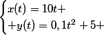 On suppose que l on a, pour tout t > ou egal a 0, x(t)=10t et y(t)= 0,1t au carre + 5.