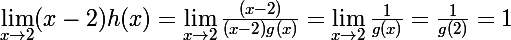h(x)=\lim_{x\to2}\frac{(x-2)}{(x-2)g(x)}=\lim_{x\to2}\frac{1}{g(x)}=\frac{1}{g(2)}=1)
