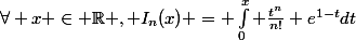 \forall x \in \mathbb{R} , I_n(x) = \bigint_{0}^{x} \frac{t^n}{n!} e^{1-t}dt